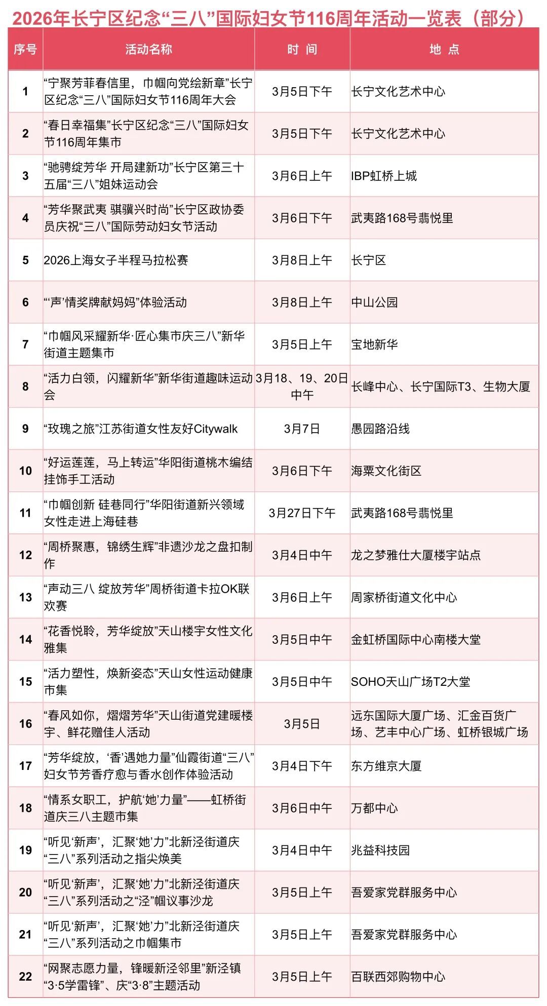 春风送暖,芳华绽放,我们即将迎来第116个“三八”国际妇女节。为致敬每一位闪闪发光的女性,长宁区精心策划了一系列形式多样、内容丰富的主题活动,从盛大集会到趣味运动,从非遗手作到城市漫步,从暖心市集到特色体验,覆盖全区各街镇、各场景,邀全区女性朋友们共赴这场春日之约,在欢声笑语中感受节日美好,在互动体验中凝聚巾帼力量。