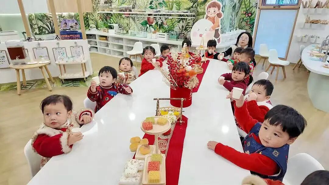 走进中福会托儿所普陀园区,张灯结彩的走廊里挂满造型各异的灯笼,萌娃们身着喜庆的传统服饰,在热闹的游园活动中迎接元宵佳节。最吸引人的当属小厨房里“搓元宵”活动,孩子们撸起袖子,小手沾满糯米粉,正有模有样地搓着汤圆。白色、绿色、紫色的糯米团子在掌心里揉一揉、搓一搓,很快就变成一颗颗圆滚滚的小丸子。