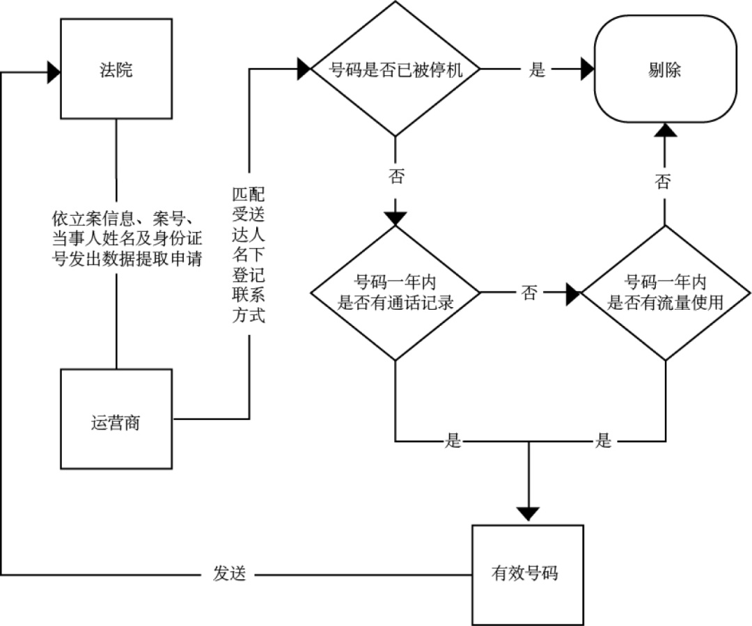 用数据智慧“解锁”和“赋能”司法生产力,是充分发挥中国特色社会主义司法体制优势的重要体现,也是向世界展现中国司法现代化成就的重要窗口。当下,不论我们想不想与大数据牵扯到一起,数据都会找到我们,覆盖我们,无处不在的数据网络为定位当事人信息,提取有效电子送达地址提供了重要条件,尤其在面对线下送达无法获得有效送达地址的案件时,活跃账户的提取、实名认证号码的确定是开启电子送达的首要条件,将成为破解送达难的关键所在。根据现行规定,人民法院可以通过中国审判流程信息公开网、全国统一送达平台、传真、电子邮件、即时通讯账号等方式送达诉讼文书和当事人提交的材料。其中所涉及的传真、电子邮件、即时通讯账号与司法内部大数据、运营商大数据、网络平台大数据息息相关,部分法院虽已开展了相关实践,但由于顶层设计不足、数据库安全无法保障、日常管理存在风险、端口对接无法统一等原因,法院系统与三大运营商、阿里巴巴、腾讯等还未建立统一的数据库以帮助信息协查,这使得当事人的信息查询无法落地实现,一定程度上阻碍了电子送达推广应用的脚步。