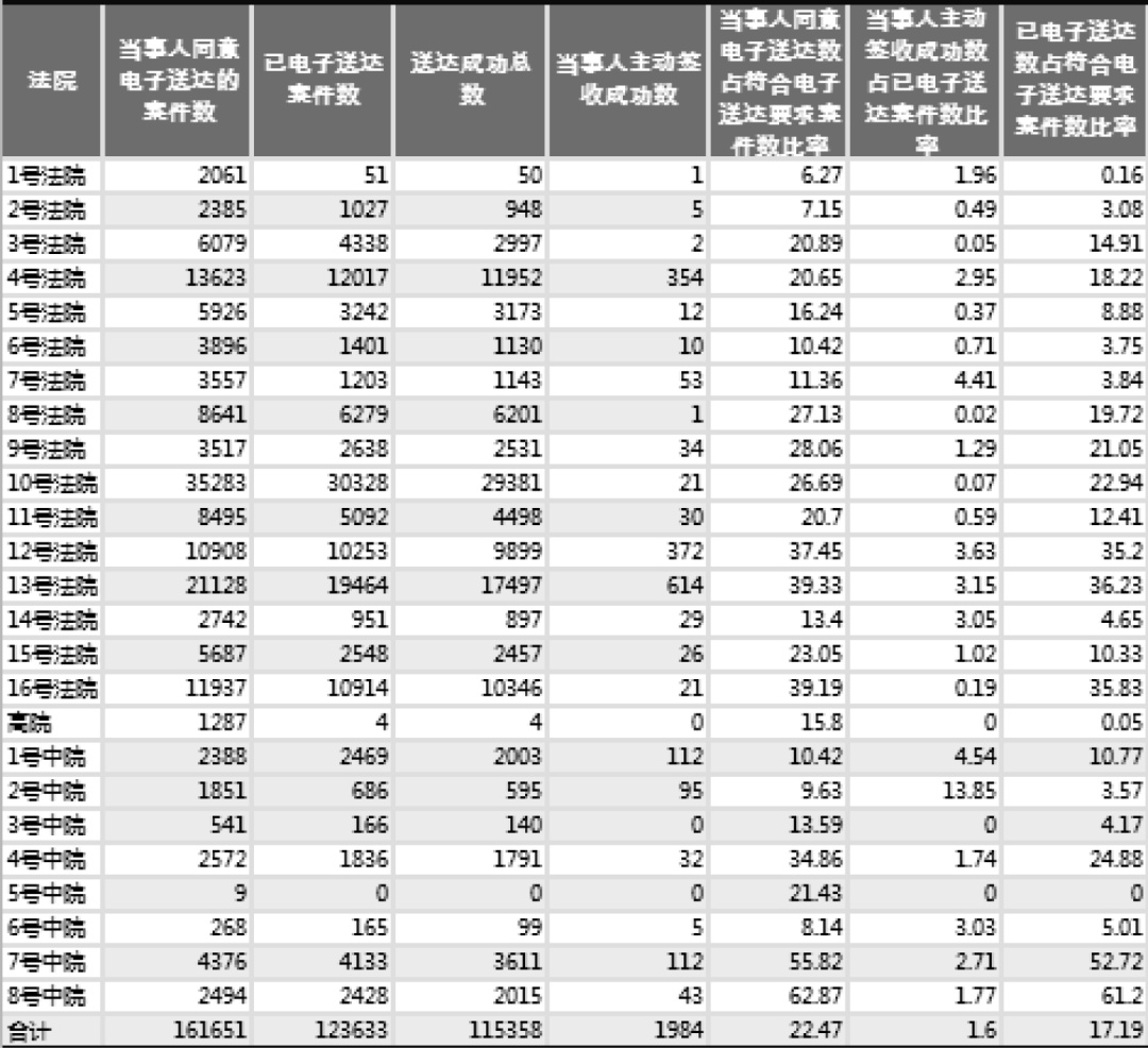 过去十年,我国智慧法院建设取得丰硕成果,全国法院已经建成世界上最大的司法审判信息资源库,全流程网上办案体系初具雏形,互联网司法模式探索不断深化。2021年6月7日,《人民法院在线诉讼规则》(以下简称《规则》)的发布,标志着新发展阶段,中国法院将肩扛向世界输出司法改革方案和司法制度规则的重要任务,身兼传播中国司法改革经验和司法改革声音的重要使命,担负推动形成“中国特色、世界领先”的互联网新司法模式的重要职责。结合《人民法院第五个五年改革纲要(2019-2013)》,聚焦互联网司法化和司法互联网化,完善全流程网上办案体系,不断完善细化在线诉讼规则,精准平衡在线诉讼中便民高效与公平正义之间的张力,让人民群众在共享互联网发展成果过程中获得司法正义是互联网时代回应人民群众司法需求的应有之义。本次《规则》的制定,涉及电子送达的使用条件、内容范围、手段方式等,细化了电子送达生效判断标准,能够有效减少“送而不达”“达而不悉”和“重复送达”的情况。但互联网技术日新月异,各地司法实践丰富,人民司法需求多元,司法诉讼领域难免存在创新余地,围绕《规则》涉电子送达相关条款的“留白”部分,本文拟进行继续探索、完善细化,以期为促进电子送达的规范性,彰显在线诉讼的时代性提供完善建议。电子送达作为完善全流程网上办案体系和推进在线诉讼的重要方面,其将纸质化材料邮寄变更为电子化数据传输的本质决定了其与诉讼行为和审判方式的变革息息相关,随着实践的深入,电子送达在实践中发挥的价值有待进一步检验和研究,本文以S市法院为例,尝试展现电子送达的运行现状。S市作为全国较早推行电子送达的地区之一,且地处沿海经济发达地区,具有较好的软硬件基础,其电子送达司法实践有一定的代表性。表一 S市法院2020年6月-2021年5月电子送达情况统计表