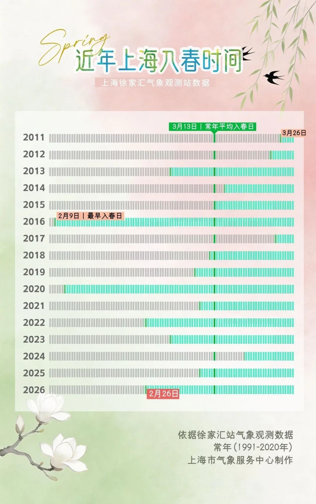今年,上海已于2月26日入春,比常年平均提前约半个月。回顾刚刚过去的冬天,2025年12月24日入冬,冬季共计64天,为徐家汇站有观测记录以来第二短的冬天(最短纪录为63天)。