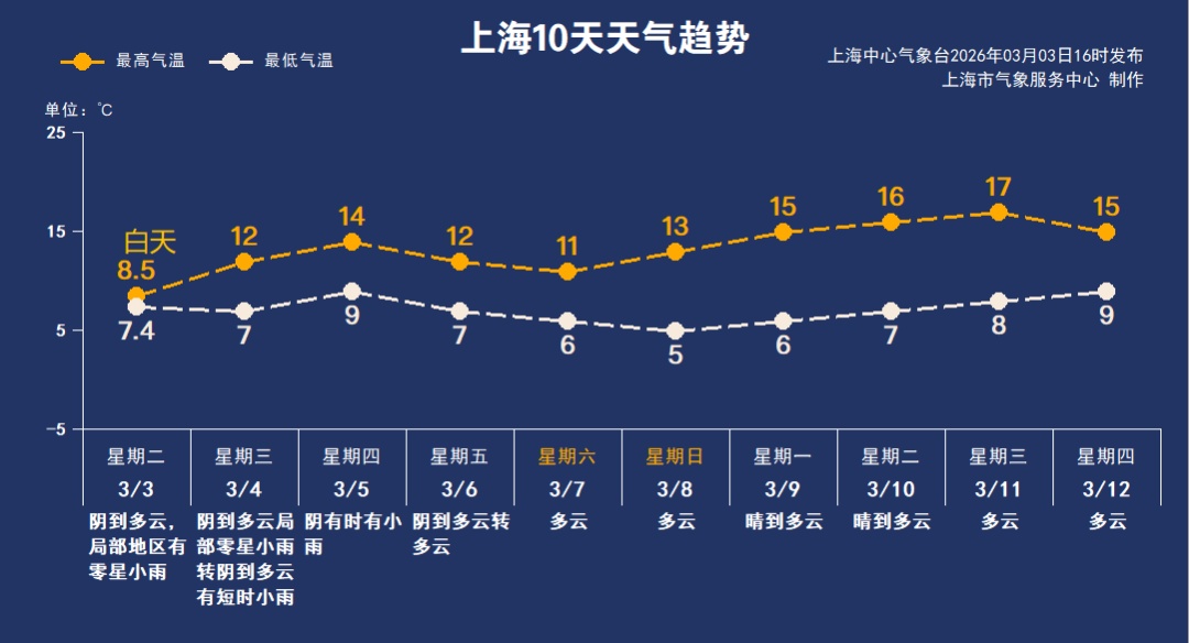 今明两天仍有小雨,周五雨止,双休日多云为主,阳光归来。本周最低气温在5~7℃之间,最高11~14℃,夜间较冷,“春捂”不能马虎。