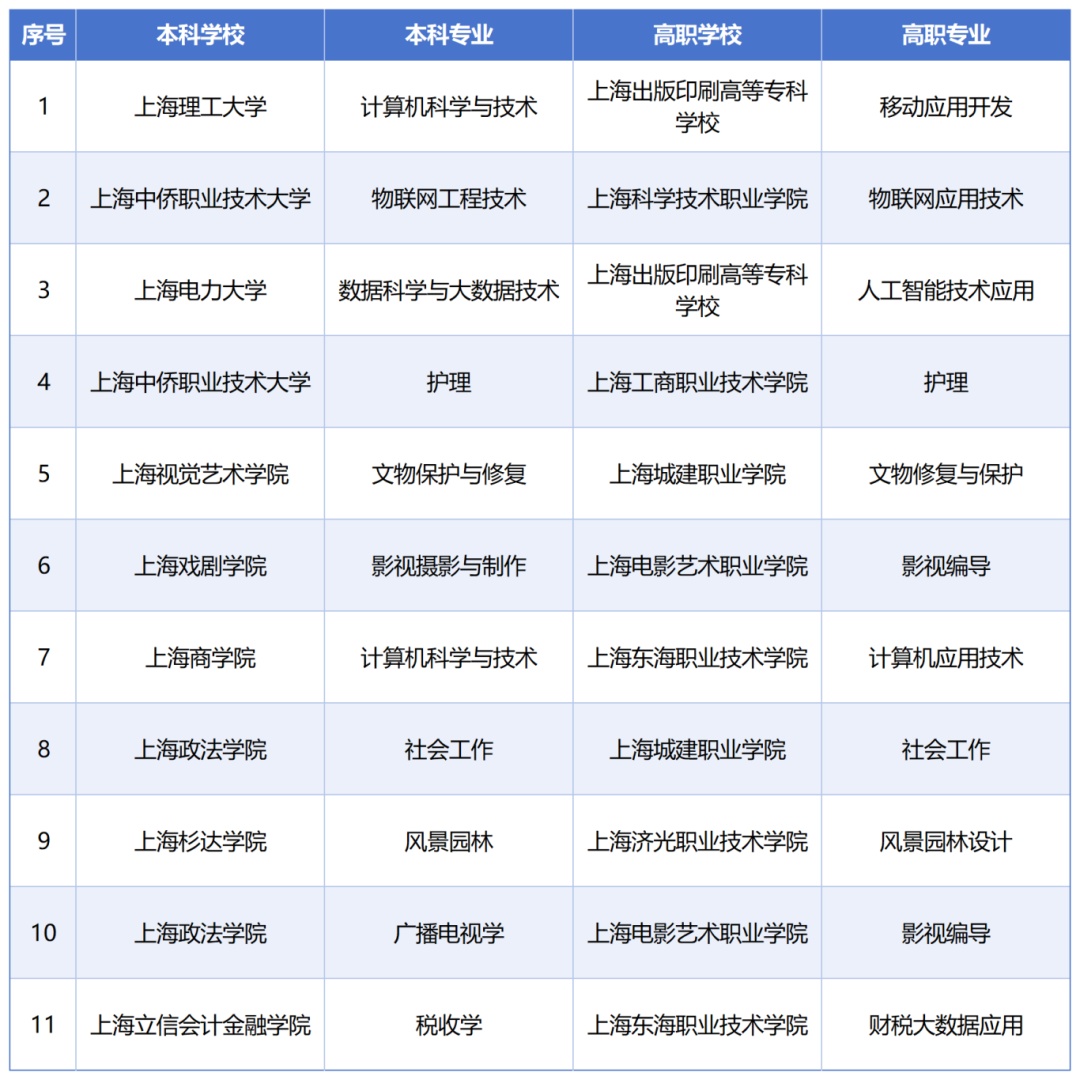 根据《上海“专科高等职业教育—应用型本科教育”人才贯通培养试点实施方案》,经学校申报、专家评议及市教委核定,同意2026年增设上海理工大学与上海出版印刷高等专科学校联合申报的计算机科学与技术等11个专科高等职业教育—应用本科教育贯通培养模式专业,相关教育教学及管理要求按有关规定执行。相关本科高校在招生中须安排专科层次高等学校毕业生招生计划。一起来看名单↓