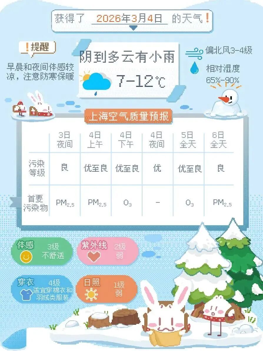 今日(3月4日)白天阴到多云为主,局部有零星小雨,夜里雨势略有增强,局部有短时小雨。早晨各区最低气温在7℃附近,预计最高11℃,相对湿度90%~65%,东到东北风3~4级,沿江沿海地区4~5级,今天夜里都转东到东南风3~4级。体感阴冷,注意防寒保暖,晚归携带雨具。