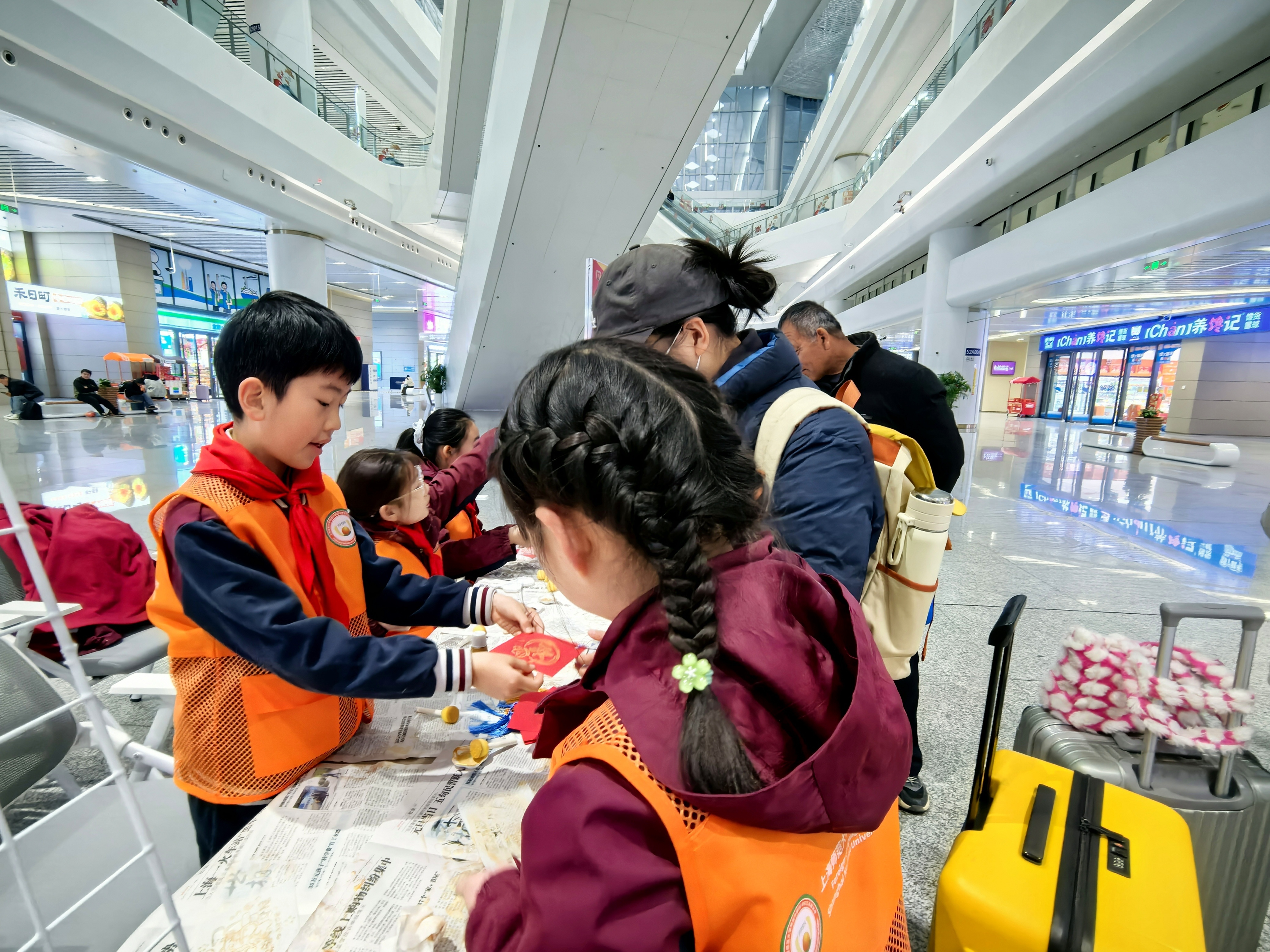 上午9时许,上师大附外小北校的学生们在老师的带领下前往上海松江站。抵达该站北区后,师生们在1楼大厅服务台旁迅速支起“福”字拓印手作摊,孩子们分工明确、协作有序:有的负责拓印装饰,有的负责派送成品,还有的热情吆喝招呼,主动邀请过往旅客参与其中,现场暖意融融。
