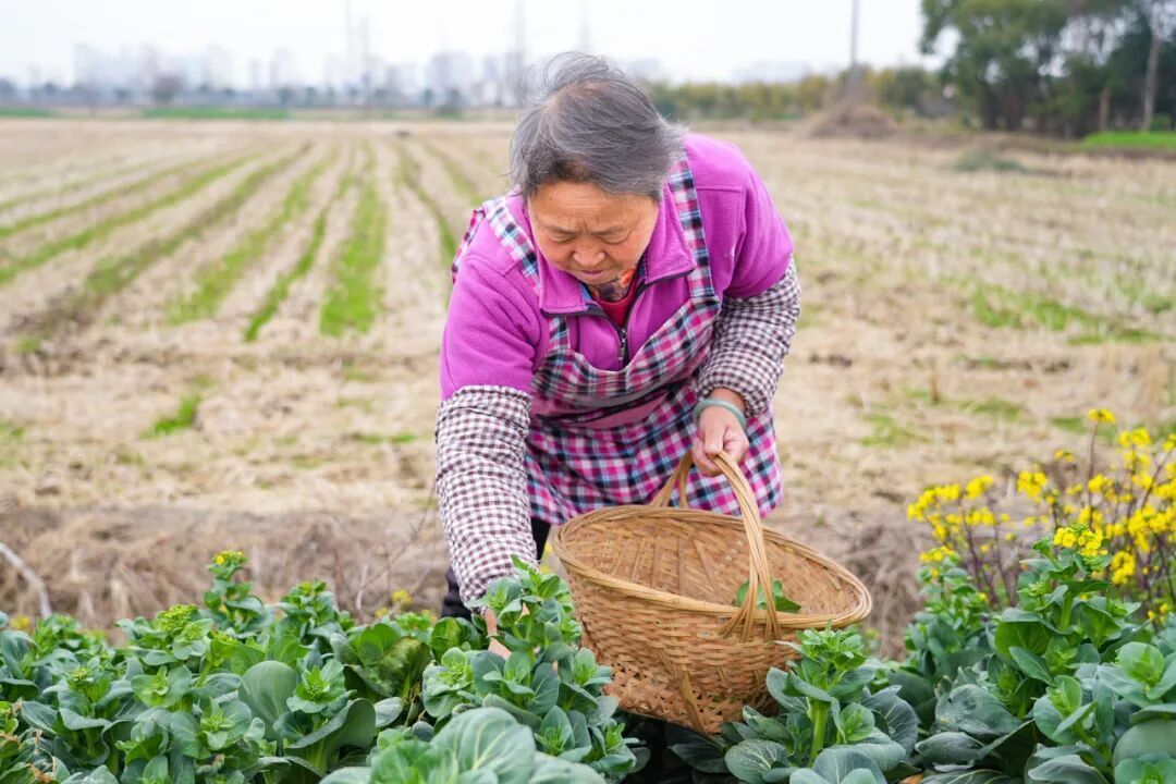 清晨的田垄间,嫩绿的菜薹顶着露水蓬勃生长,正是一年中最鲜嫩脆甜的时候。三桥村的村民曹阿姨早早挎着竹篮,在菜地里细心挑选、采摘长势最好的菜薹,这是烹制“冬去春来饭”最应季的食材。
