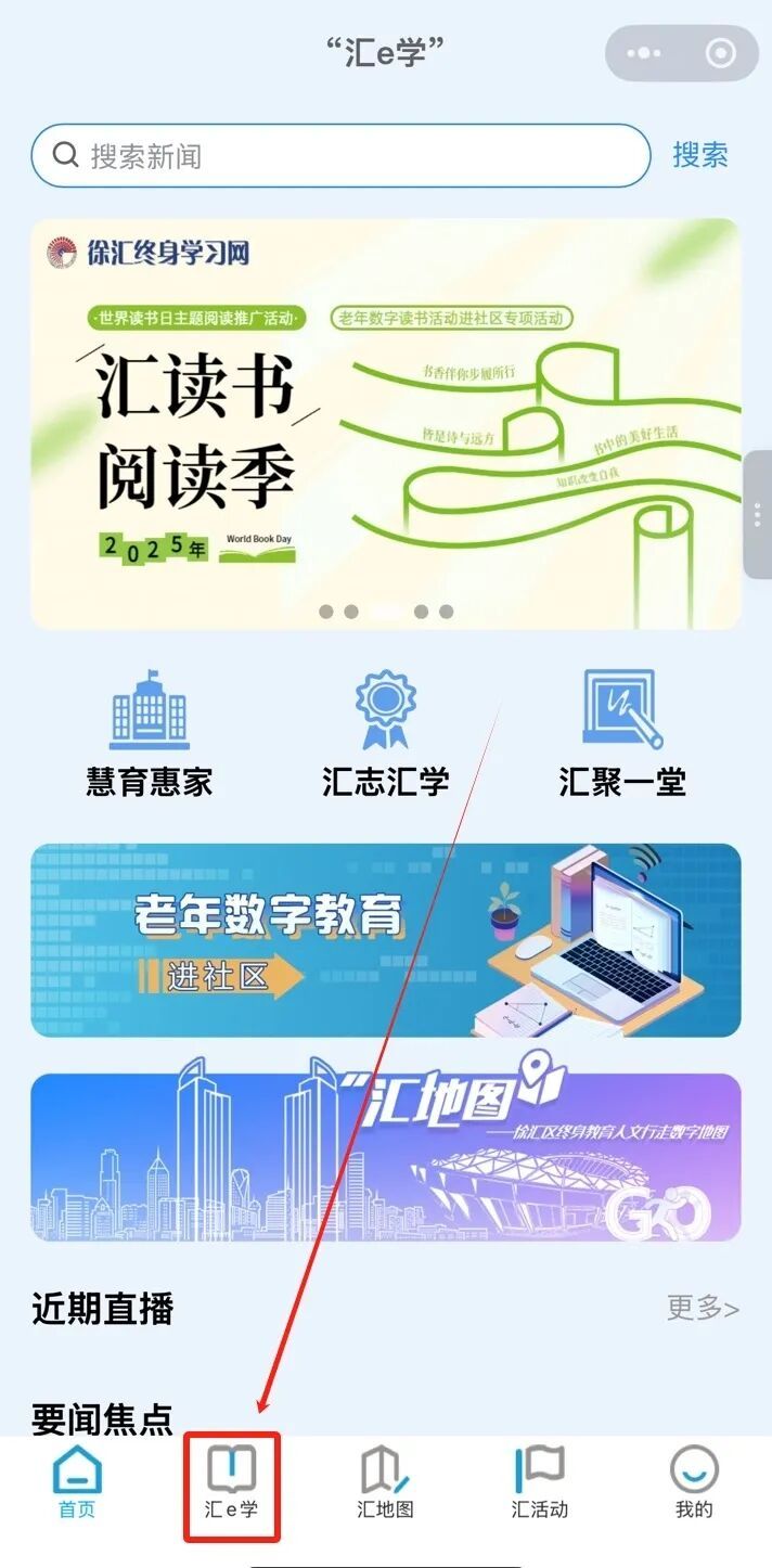 请进入徐汇终身学习网网页:https://www.xhsqjy.com/,登录后进入直播栏目观看。