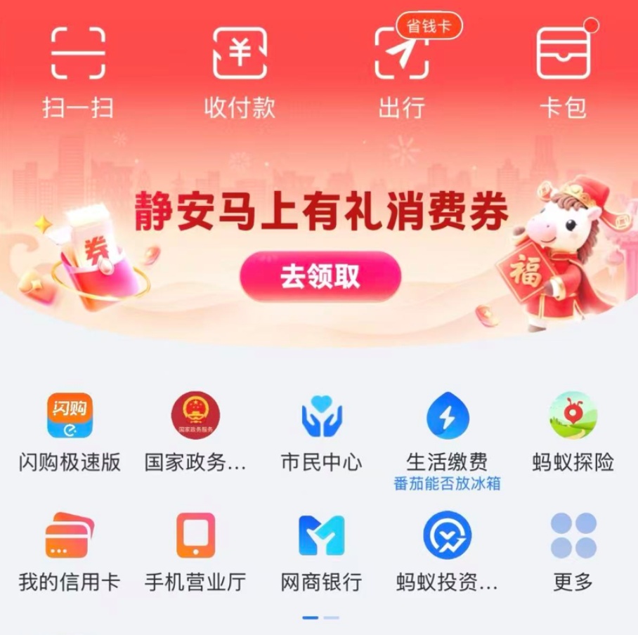 消费者通过支付宝App首页氛围图跳转活动页面领取或在首页搜索“静安消费券”“静安新春券”“静安马上有礼券”。
