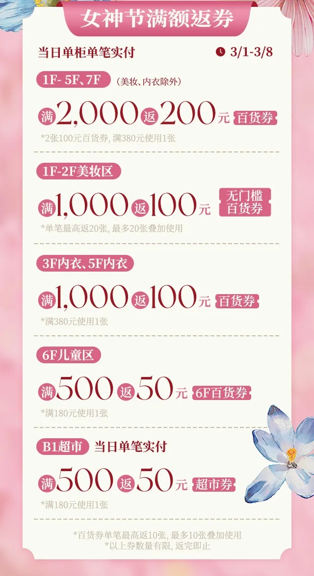 上海久光百货:3月1日至3月8日推出女神节满额返券、满额赠礼、会员专属积分兑换、餐饮折扣等多重礼遇,美妆、服饰、儿童区、超市全品类覆盖,节日氛围拉满。