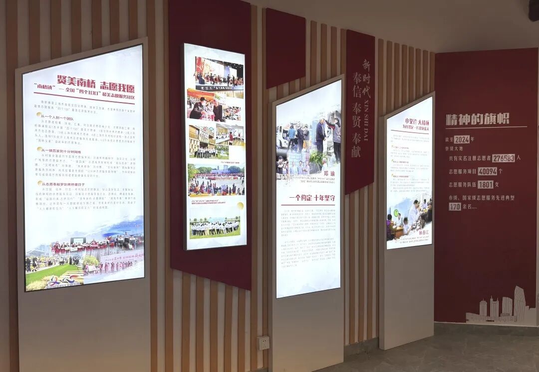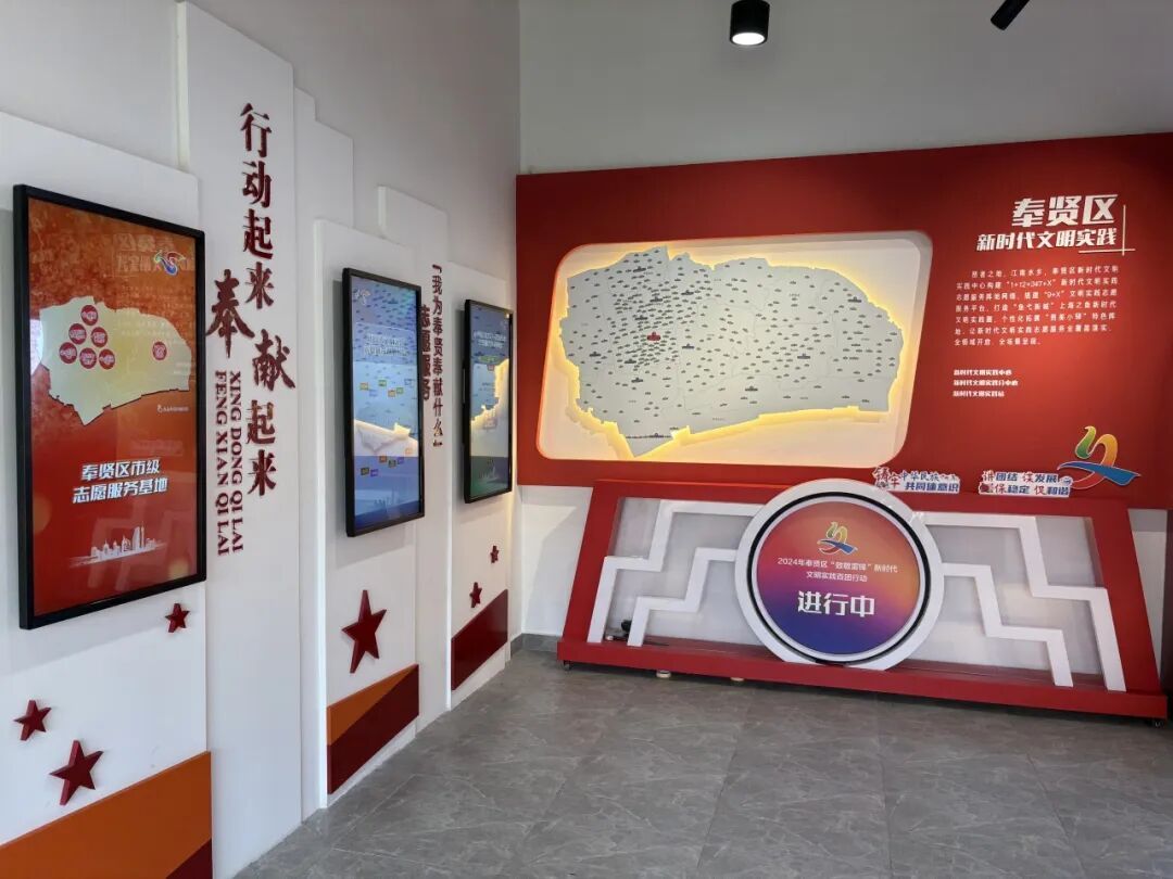 新时代文明实践阵地图见证着奉贤区文明实践从“全覆盖”向“全领域、全场景”迈进;电子互动区流动展示了奉贤区志愿服务先进典型、优秀志愿项目以及志愿服务基地等,是奉贤人对雷锋精神的生动践行。