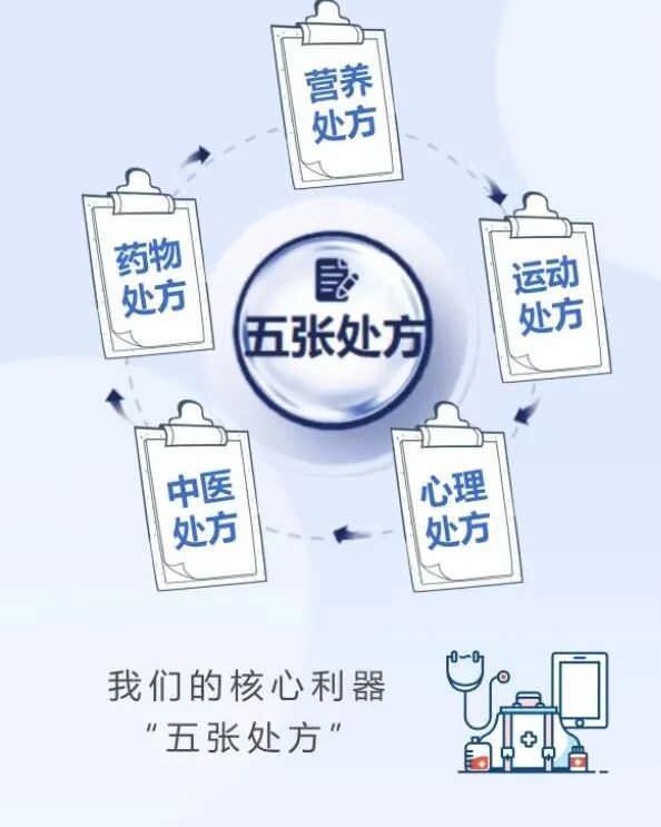 我们打破传统“管住嘴、迈开腿”的单一模式,整合多学科资源,为每位患者量身定制五张一体化处方: