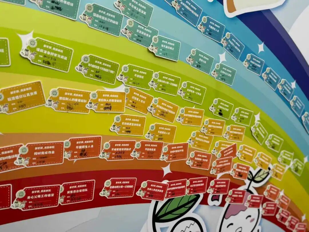 这是学校特意设计的“幸福加马”迎新环节。学校将少先队“诚实、活泼、勇敢、团结”四大作风,化身为红、橙、金、蓝四色“先锋小骑士”。孩子们抽取行规目标,能做到的签上名字贴上“彩虹桥”,暂时做不到的带回教室继续努力。