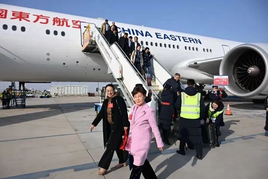 3月3日下午,在沪全国人大代表抵达北京,出席即将召开的十四届全国人大四次会议。上观新闻 图
