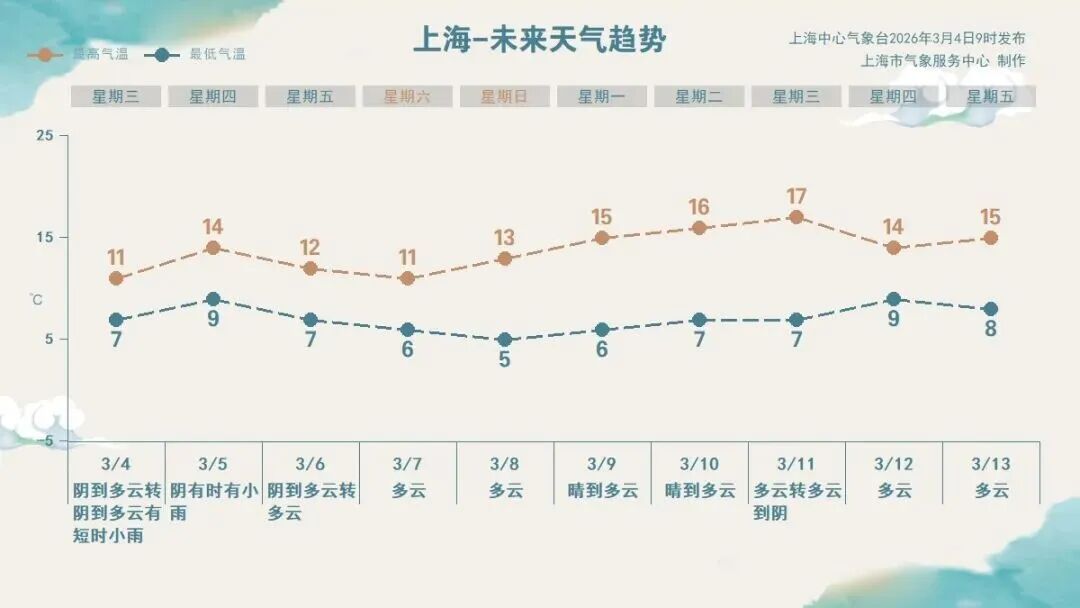 天气趋势:周五上海雨止转为阴到多云天气。双休日到下周,上海阳光“大满贯”,气温也逐渐回升,下周中的最高气温可升至17℃左右,暖意融融的春天正式登场!不过需要注意的是,早晚天气依然较冷,市区最低气温在5~7℃之间,郊区更低,“春捂”不能马虎。