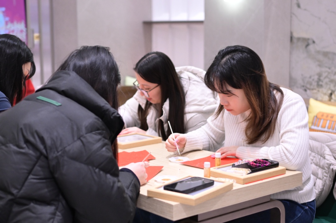 非遗手工体验区特别准备的DIY项目主打差异化:学生们动手制作灯笼,在实践中了解灯笼的制作技艺和悠久的灯笼文化;青年们拿起画笔,蘸上金粉颜料,描画和渲染出对新一年的期盼。