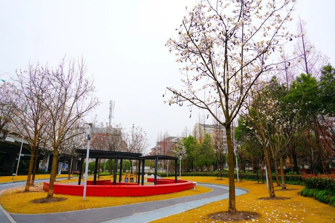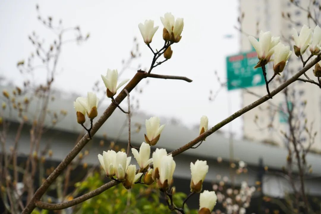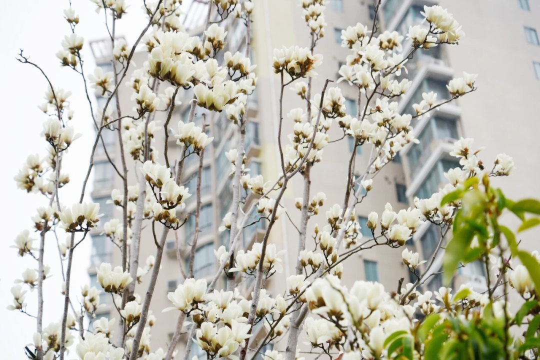 随着慢行步道延伸进生活街区,近80株玉兰成排栽植在闹中取静的绿化连接带内,枝头已挂满了饱满的玉兰花苞。