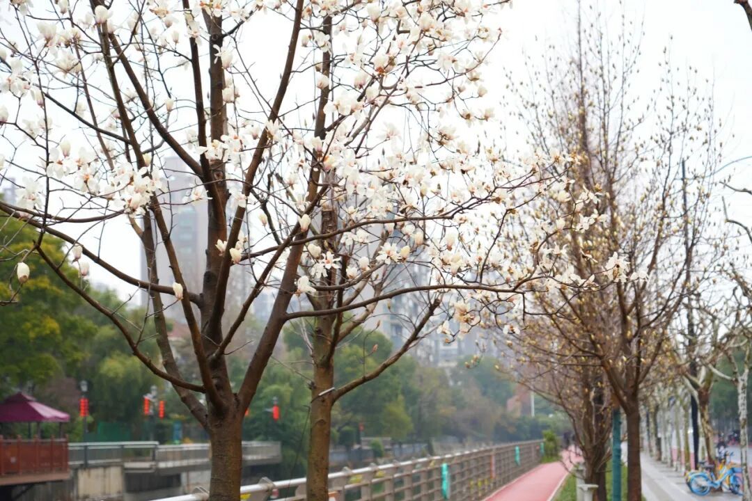 2021年被评为上海市绿化特色道路,以玉兰、八仙花等为特色植物。沿河的玉兰虽没有绿叶衬托,却依然开得那么纯粹、热烈,独自绽放着春日的风华。