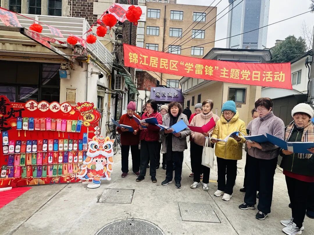 活动一开始,黄浦区委宣传部、永嘉物业、新锦江大酒店、锦江饭店、国泰电影院、工商银行久事复兴大厦支行、GM眼镜店、春生夏长油画室、上海礼和文化传媒有限公司等党建联建单位代表与居民志愿者共同登台,定格了一张“锦江大家庭”的团圆照。随后,锦江社区合唱队唱响《我们走在大路上》,本命年属马居民登台领取定制小马挂件并互致吉祥话,现场洋溢着浓浓的节日氛围。