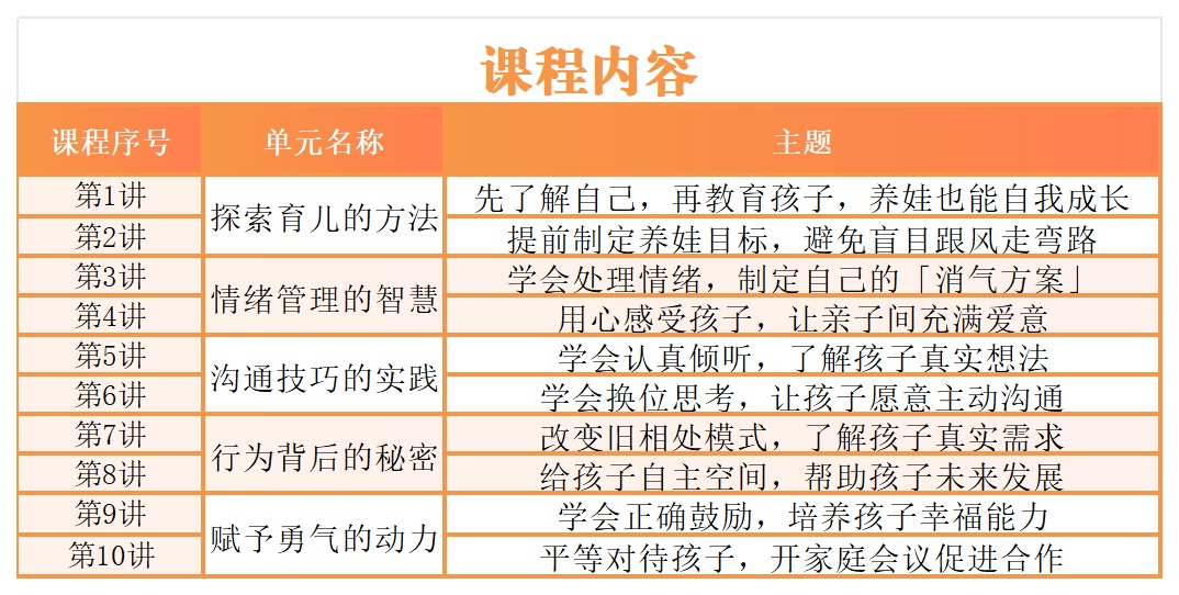 本次课程共有10节,融合积极心理学、脑科学前沿理念,以正面管教为实操方法,通过体验式学习帮父母走出“不是骄纵就是惩罚”的育儿误区,读懂孩子行为背后的需求,打造尊重、合作的亲子关系,让育儿轻松从容,家庭亲密和谐!