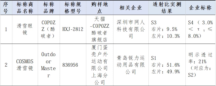 本次测试中,S3和S2级样品居多,分别有15款和6款,适配主流滑雪场景;但有8款样品未标注可见光透射比等级或数值,2款样品实测与标称信息不符,不标注或错误标注可见光透射比信息可能会误导消费者选择,选错易导致视野明暗不适、眼部疲劳;此外,对其他透射指标进行测试发现,不同样品的太阳紫外线透射比、平均透射比、左右镜片透射比差异、左右镜片透射比相对变化、散射光等指标存在一定差异。