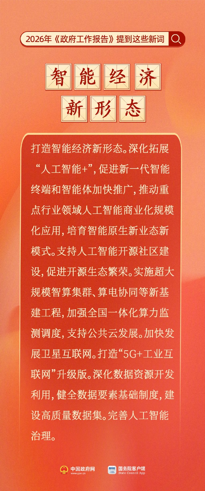 划重点!今年《政府工作报告》提到这些新词:“城乡居民增收计划”“中小学春秋假”“未来能源”“中国服务”“智能经济新形态”“新基建工程”“卫星互联网”“地方政府招商引资 鼓励和禁止事项清单”“世界级城市群”。