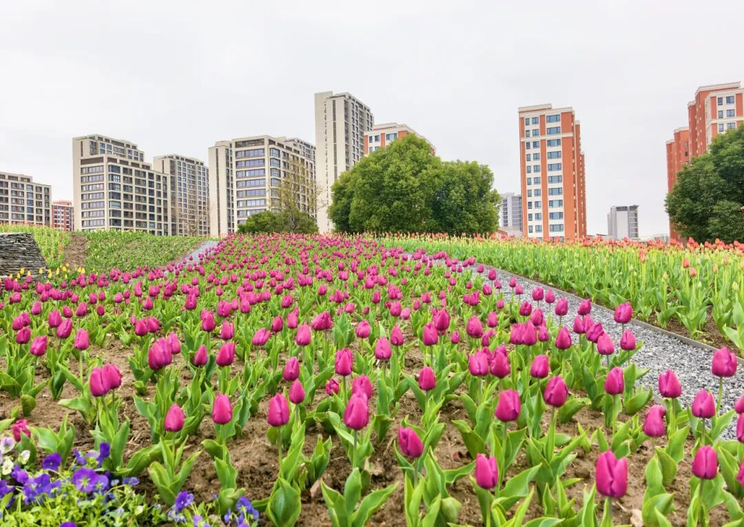 上海市普陀区TOP中央公园新增一片郁金香花海,位于常和路、古浪路区段,是春日里不容错过的视觉盛宴。这片花海占地14000平方米,依托起伏的山谷地形,各色郁金香以流线型色块铺展,粉、红、橙、紫等色彩交织成灵动的大地艺术画卷,既延续了书法般的流动韵律,又尽显春日的绚烂生机。