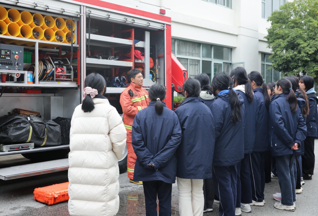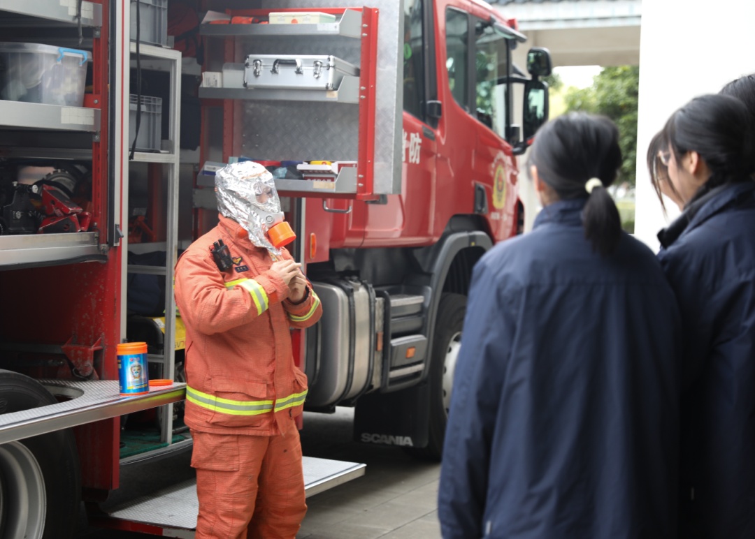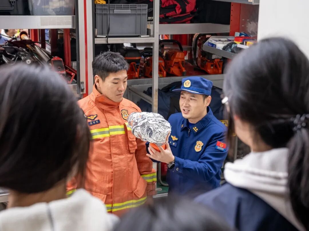 在实操环节,消防员现场演示了干粉灭火器及防烟面罩的正确使用方法,在消防员的指导下,师生们通过“沉浸式”学习,初步掌握了初期火灾的处置要领。在消防车辆和装备展示区,消防员以通俗易懂的语言,向同学们详细讲解液压破拆工具组、无齿锯等装备的名称、性能以及在抢险救援中发挥的关键作用,学生们借此机会见识了消防车上的丰富器材,学习了相关消防装备的作用,观摩了消防员对相关装备的演示操作。