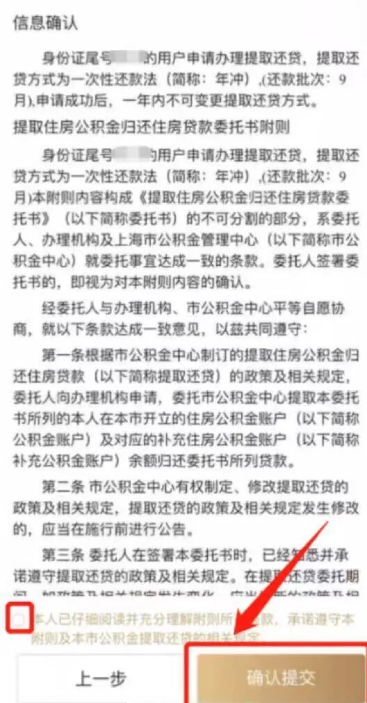 第五步:再次确认信息,阅读并勾选同意《提取住房公积金归还住房贷款委托书附则》后,点击“确认提交”按钮,借款人即可完成申请提交。
