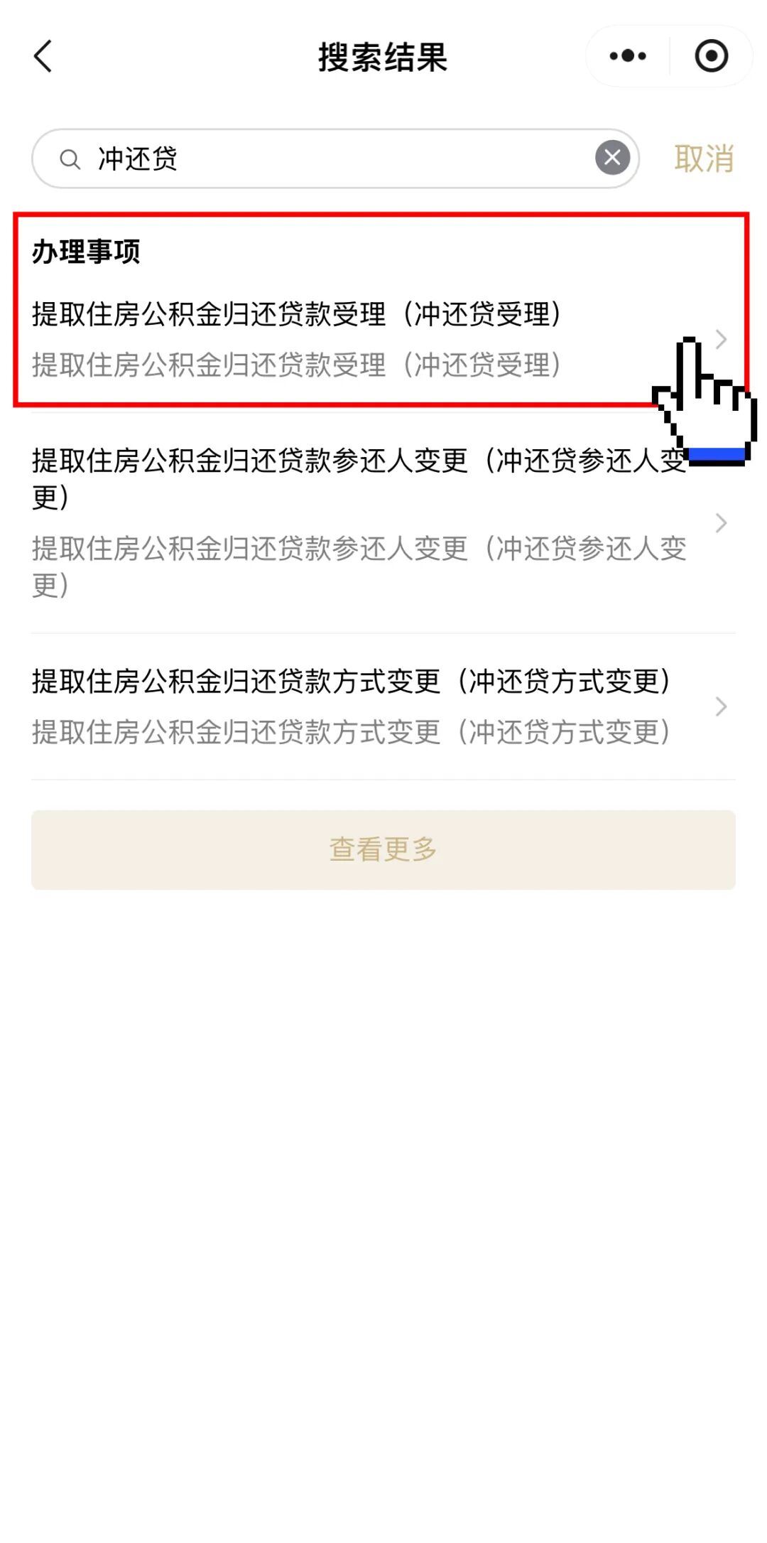 第一步:在首页搜索框中输入关键词“冲还贷”,找到提取住房公积金归还贷款受理(冲还贷受理)服务,点击进入。