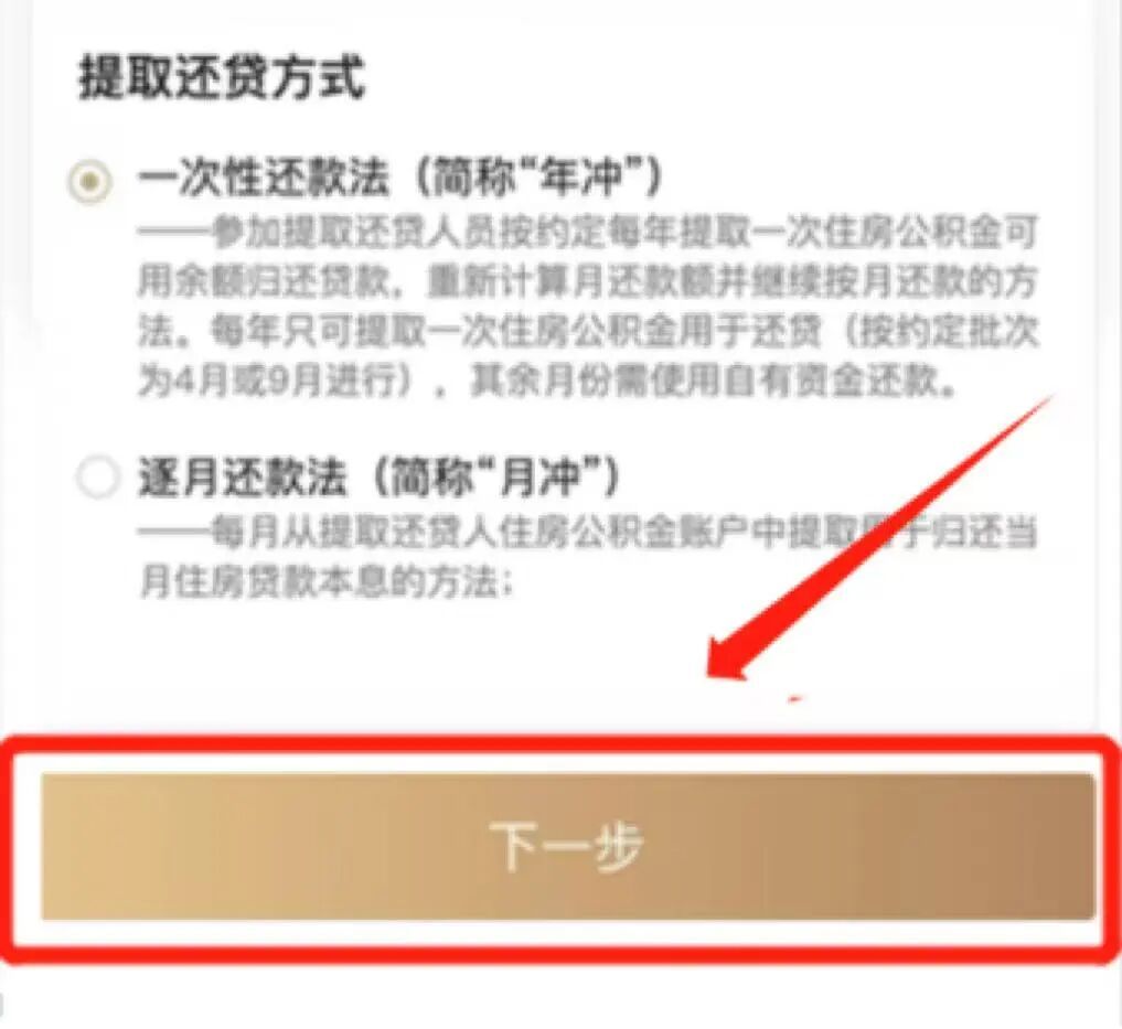 第四步:根据自身实际情况选择提取还款方式,选中“一次性还款法”或“逐月还款法”按钮后,选择“下一步”。
