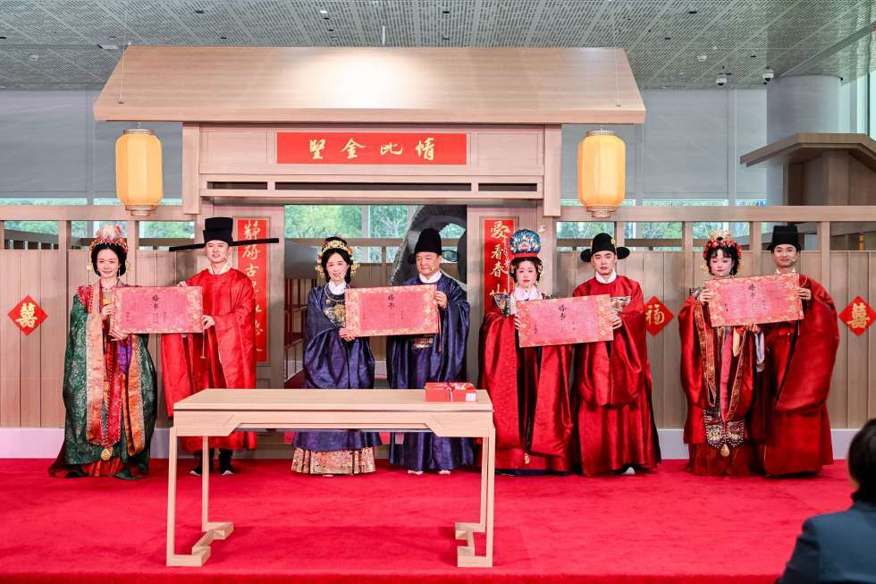 3月3日元宵佳节,在这个最初被称为“上元节”,至宋代逐渐演变为青年男女相识相恋的浪漫节日里,展厅外廊欢声雷动,新人们身着唐、宋、明三代典雅婚服,在两部宋版《金石录》的见证下,循古礼许下相守诺言,完成了一场跨越古今的“金石之盟”。