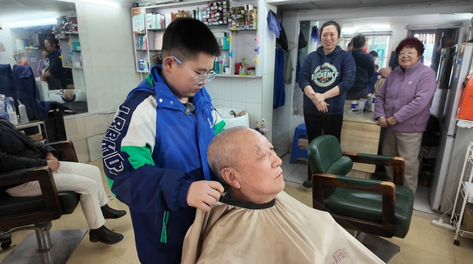 2月28日,寒假最后一天,岭南路270弄小区内的社区理发店里暖意融融。在这个十多个平方米的小空间里,阳曲路小学五年级学生赵恒宇正忙着做准备——趁着假期最后一点空闲,他要为熟悉的老邻居们免费理发。