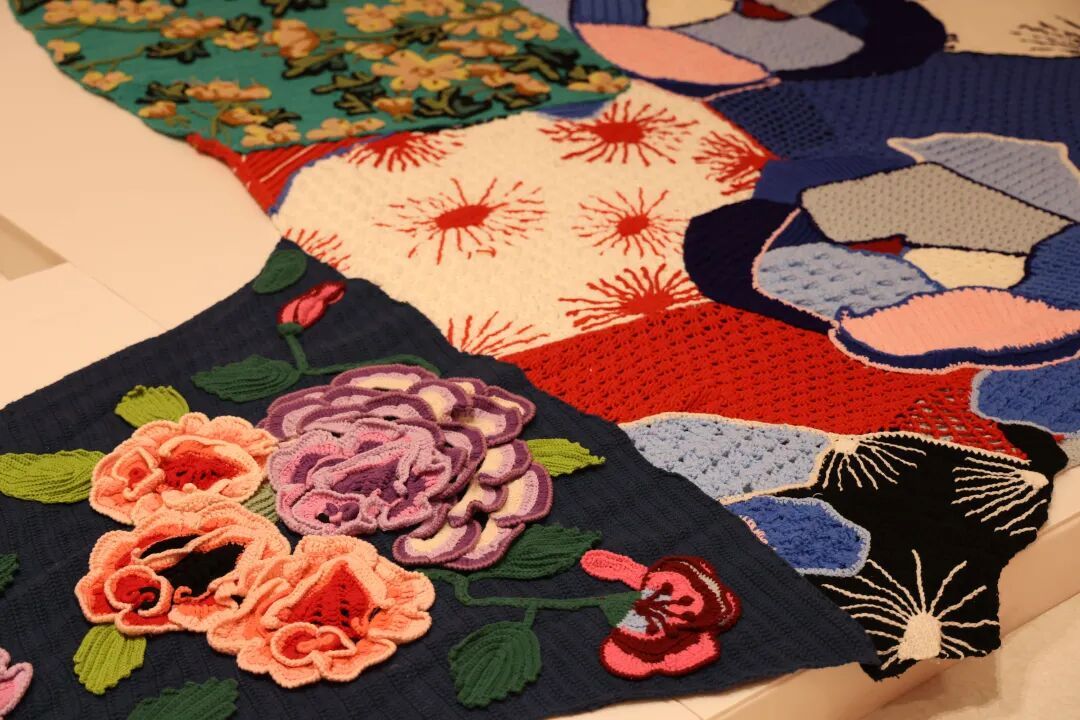 展览中最让我驻足流连的,是那幅巨型钩针编织《闵行地图》。这件作品长9.1米、宽13.5米,如此宏大的尺幅,更凸显出创作的艰辛与匠心的厚重。创作团队巧妙运用了辫子针、短针、中长针、长针、长长针、虾结针、拉针、半边短针、枣形针等多种钩针技法,通过丰富的纹理与色彩变化,将闵行区的十四个镇、街道及工业区生动地勾勒出来。它彻底超越了传统地图的平面表达,以千变万化的钩编花样对各区域进行艺术化演绎。