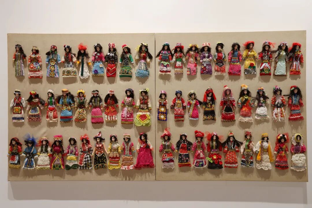 除了以上展品外,其他作品也是精彩纷呈。《繁花莘庄》系列撷取本土玉兰、桃花的灵秀之形,立体钩织的花瓣层次错落,细棉线勾勒的花脉清晰可辨,嵌入LED灯珠的花蕊搭配质朴的仿竹编底座,让这一抹传统纹样在光影流转中漾出乡土美学的温柔。《时光针语》系列则大胆突破材料边界,金属光泽的冷冽与珍珠的温润织就项链、胸针等饰品;尤其是“星辰胸针”的镂空星芒设计,自带潮趣质感,成为年轻人追捧的非遗潮品。《56个民族》主题作品以极致细腻的针脚,精准还原各民族特色服饰纹样,一针一线都凝聚着民族团结的深厚温情;《青山绿水》系列则以深浅渐变的绿线铺陈山河肌理,钩织的草木葱茏、溪流潺潺栩栩如生,将生态之美与非遗技艺完美融合。