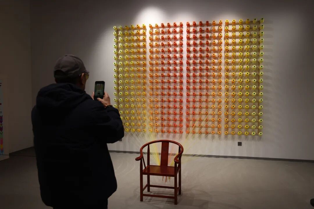 展厅中的核心装置,则为钩针技艺注入了全新的表达。数百个黄、橙、红三色的线轴以矩阵整齐排布于墙面,丝线如光带般放射而出,汇聚于下方的中式圈椅之上,形成强烈的视觉张力。那一把圈椅,既是旧时织女的劳作座席,也是当代观众的共情之座,邀人坐入钩针技艺的时空经纬之中。线轴的色彩渐变,既是钩针线团的本色,也暗含着从“新生”到“热烈”的情感递进;放射状的丝线,既是钩针“编织”动作的抽象演绎,更象征着十万织女的生计与梦想。是啊,莘庄百年的记忆与当下,都在这根细线上交织成网。它以极简的当代语言,重构了钩针技艺从谋生手艺到生活美学的蜕变,恰是“织梦莘生”主题最直观的视觉注解。