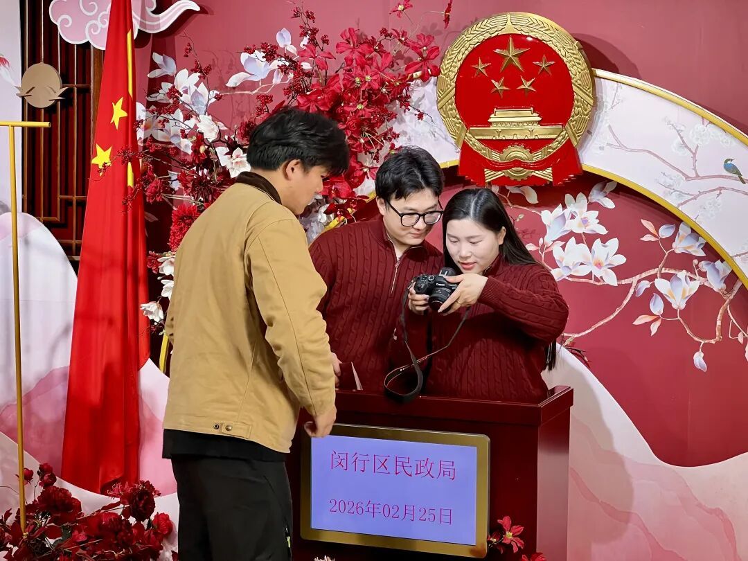 走在闵行文化公园,满目苍翠间,西侧一栋朱红色的小楼格外惹眼。一对新人刚从颁证厅走出来,新娘手捧鲜花,新郎小心翼翼地为她整理头纱,摄影师“咔嚓”一声,定格下这美好的瞬间。 这里是闵行区婚姻(收养)登记中心(以下简称闵行婚登中心),也是新人争相打卡的“网红领证地”,还是刚刚荣获2025年度“全国巾帼文明岗”的先进集体。就在刚刚过去的元宵节,一场“元上佳缘”主题活动让这里成了幸福的海洋——新人们提着福袋猜灯谜,共度佳节。 从一纸证书的办理窗口到承载甜蜜记忆的城市文化地标,这万绿丛中的一点红,早已不只是公园的一处景观,更是无数家庭幸福开始的地方——