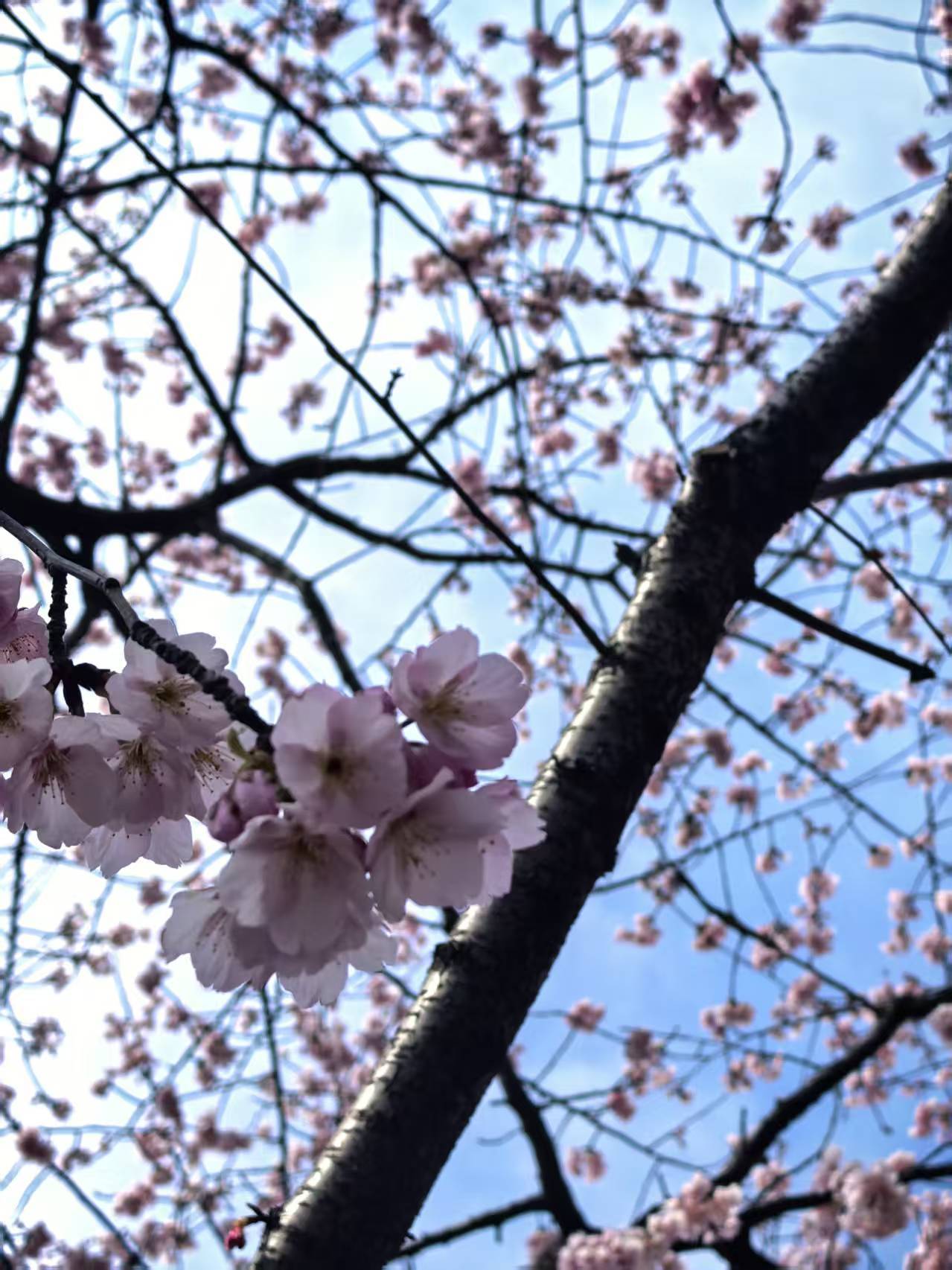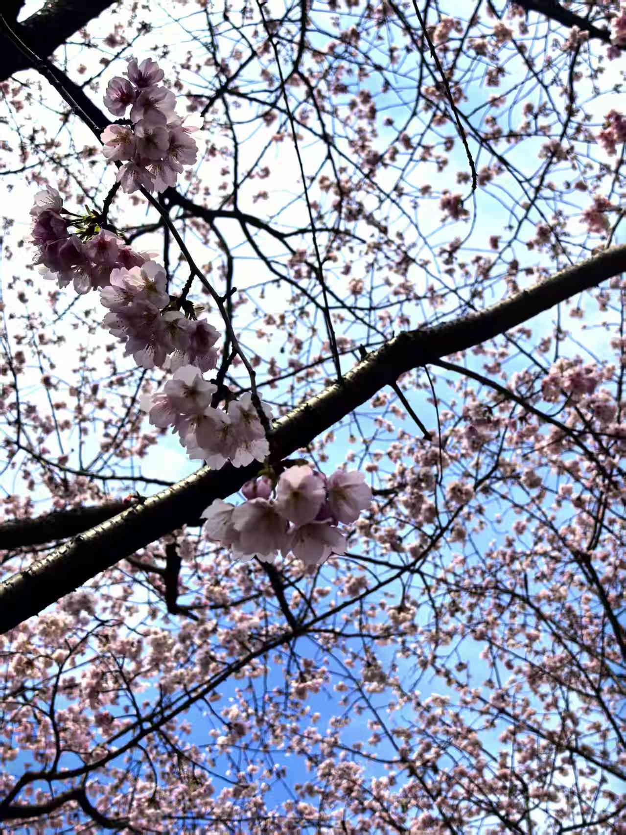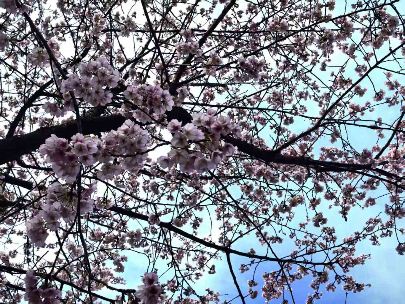 樱花簇拥成粉白云朵