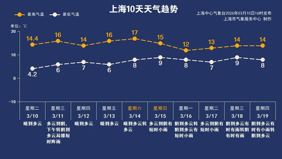 3月14日(周六):晴到多云转多云,8~17℃