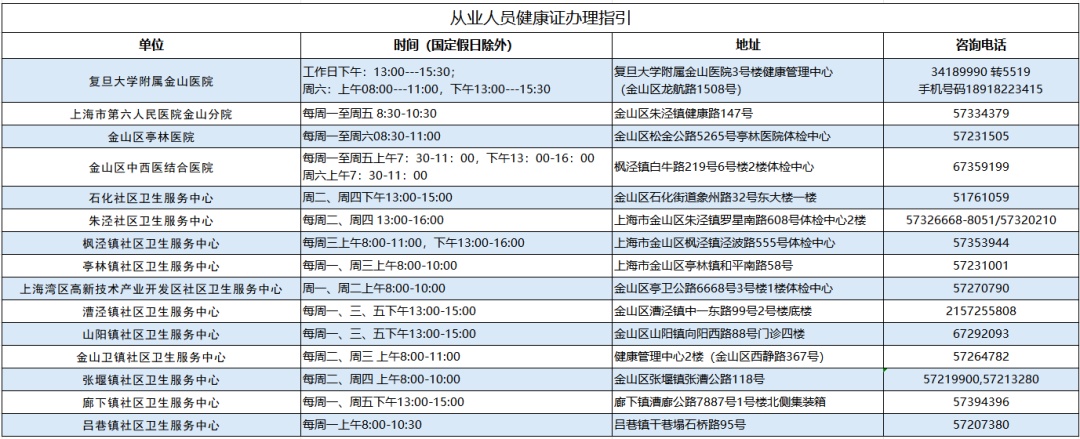 这份 “金山区从业人员健康证办理全攻略” 请务必收好!小编为您梳理了全区各办理点的详细地址、工作时间、联系电话以及从预约到领证的全流程指南,让您办证不再“跑空”,轻松上岗!