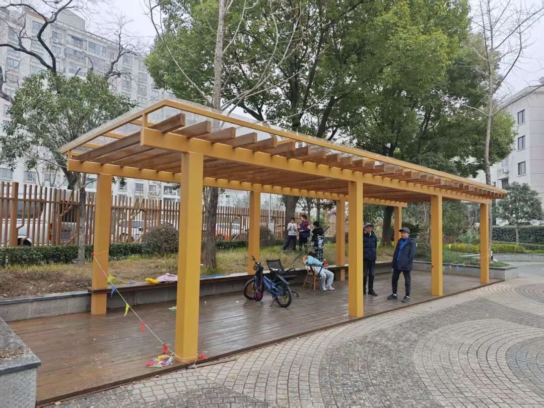 改造过程中,施工队对连廊木质结构进行全面检修,重新涂刷环保木油。不仅有效防护木材、延长使用寿命,更让连廊焕发新颜,与口袋公园的绿植景观相得益彰。同时,在连廊顶部加装透明亚克力板,既能遮挡风雨、隔绝暴晒,又不影响采光,让居民在任何天气都能安心休憩。