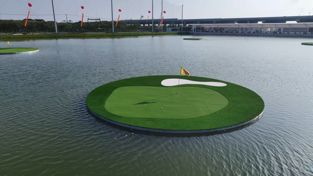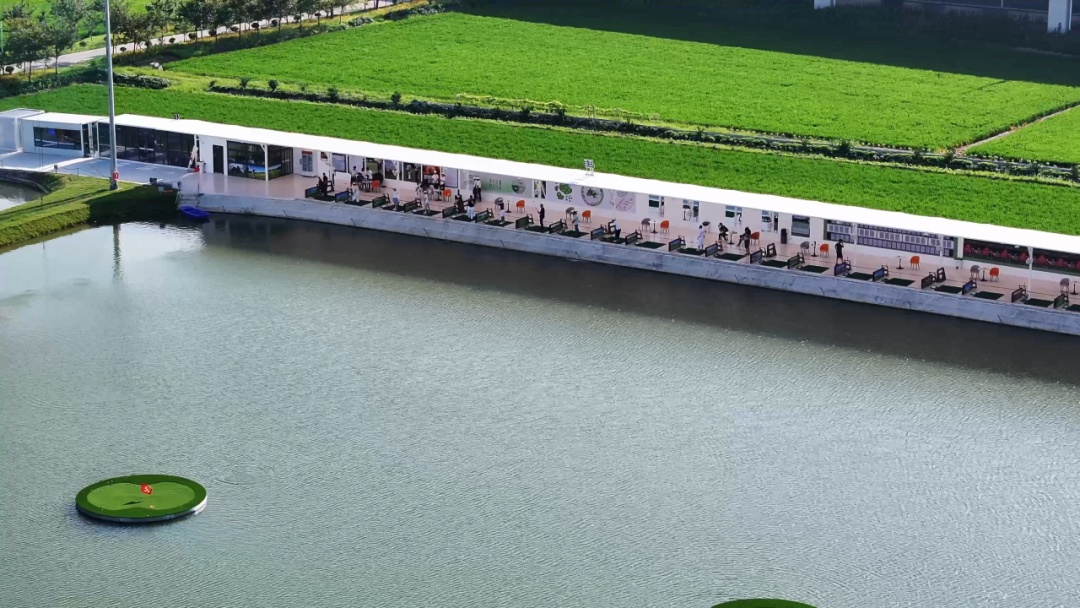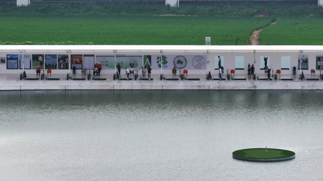 看高尔夫球在空中划出弧线,最终落入水里激起一圈圈涟漪,或是精准“登岛”,那种治愈感是室内练习场给不了的。