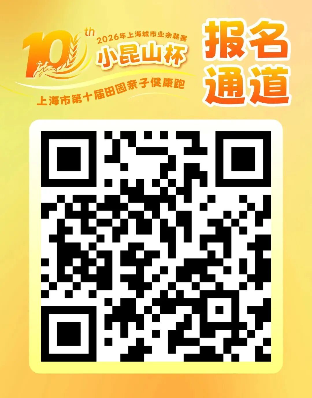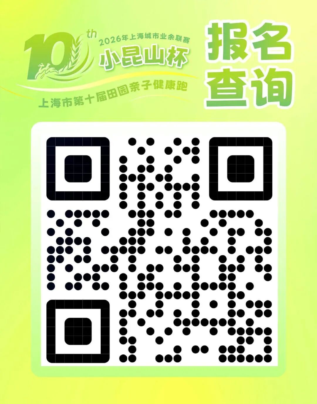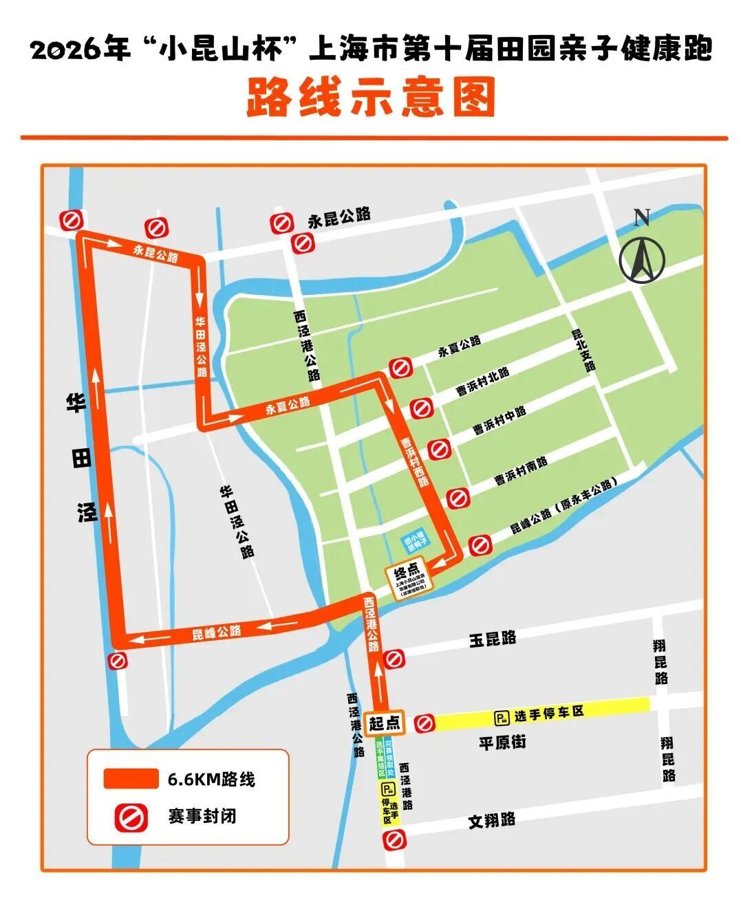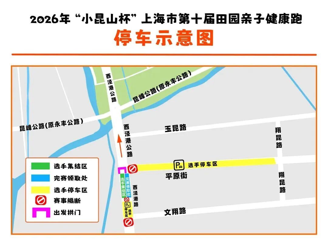 PART. 01 活动概况 活动时间 2026年3月22日(星期日) 8:00-11:00 活动地点 小昆山镇万亩良田 (开幕式:西泾港路平原路口) 参加对象 3-12岁青少年儿童家庭 (每组家庭至少1名家长+1名12岁以下儿童) *限报300组家庭 赛事组别 6.6KM竞赛组(100组家庭) 计成绩 以家庭成员同时抵达终点为判定基准 6.6KM兴趣组(200组家庭) 不计成绩 快乐奔跑为主 报名费用 赛事路线 PART. 02 赛事亮点 2017年9月23日 近千人在万亩良田出发 2026年春天 第十届亲子田园跑如约而至 十周年 赛事全面升级 十大亮点重磅来袭 亮 点 一 寻找十岁同龄宝宝 寻找2017年9月23日出生,与小昆山路跑同时“起跑”的小宝贝,免费参加第十届亲子跑并赠送精美礼品一份。(限十位,以报名顺序为准,先到先得) 亮 点 二 十周年专属纪念卡&签名墙 签名墙,在绿野清风下写下你的亲子跑故事,定格十年美好。纪念卡片印刻赛事LOGO与小昆山田园风光,加盖专属纪念戳,把小昆山的春日美好收藏成册。 亮 点 三 经典农趣嗨不停 抓小猪、抓小鸭、农趣嘉年华,在万亩良田间撒欢,解锁农耕智慧与乡野乐趣。 *参与规则另行通知 亮 点 四 千人国旗传递 在诗意田园间共唱《我和我的祖国》,以热血与温情,为十周年赛事添彩。 亮 点 五 专业芯片计时 竞赛配备芯片计时,公平公正公开,在如画赛道上见证每一份努力与坚持。 亮 点 六 十周年定制福利 小昆山大米、新鲜鸡蛋完赛好礼,把小昆山的田园风物带回家。 *以实物为准 亮 点 七 赛事奖金 注:奖金为税前金额 亮 点 八 十年专属赛事包 含定制T恤、号码布、补给品等,诚意满满,参赛即享。 亮 点 九 专业亲子跟拍 全程摄影师抓拍,定格奔跑瞬间、温馨笑脸,免费获取高清大片,记录美好。 亮 点 十 十年限定纪念奖牌 专属第十届定制奖牌,完赛即得,收藏十年珍贵回忆。 *以实物为准 PART. 03 报名方式 报名截至3月16日 报名须知 1.报名人员均需身体健康,无心脏病、高血压等不适合户外运动的疾病。如刻意隐瞒或因身体不适依然参与比赛导致意外情况的由本人负责; 2. 费用缴纳之后不予退回,如因主办方原因赛事取消的,将原路退回报名费用,也可用于赛事重启之后的费用; 3. 一个家庭仅需报名一次,内容信息需填写准确,仅限于家庭内爸爸妈妈携带自己的孩子参加(如核查非一个家庭报名则取消参赛资格,且费用不退),1大1小、2大1小和2大2小,身份证信息用于购买保险; 5. 报名家庭需关注赛事官方公众微信号(着意体育),了解赛事包发放、自驾停车、参赛福利等重要信息!赛事合作咨询加微信号:guowangfc; 6. 报名缴费既接受上述事项要求,未尽事宜,解释权归主办方承办方所有。 PART. 04 到达方式 自驾 1. 参赛人员须在比赛日早上8:00前按照安保及工作人员指引将车辆停放在图示停车区域; 2.停车区域不收费,须提供组委会提供的停车证(报名成功后发放)进入; 3.比赛日上午11点前赛道管制,车辆无法离开现场; 4.8:10自驾停车场关闭; 5.选手停车区车位已满后请自行寻找周边停车区停车。 PART. 05 赛事包领取 领取时间 3月20日 14:00-20:00 3月21日 9:00-20:00 领取地点 松江区光星路755号 山河体育场 领取内容 赛事包、赛事T恤、号码簿、停车证等 *以当天实际领取为准 *参赛T恤尺码先到先得,无法确保每位参赛者尺码合适,敬请理解。 2026年3月22日 小昆山镇万亩良田 不见不散!