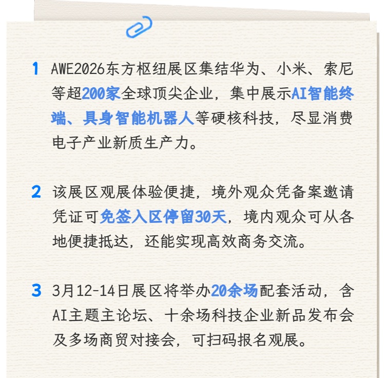 3月12-15日,2026中国家电及消费电子博览会(AWE2026)即将启幕。作为全球家电及消费电子领域三大展会之一,本届展会解锁“一展双区”新模式,在上海新国际博览中心与上海东方枢纽国际商务合作区同步开展。以“AI科技·慧享未来”为主题,展会将汇聚1200余家企业、逾万件前沿科技产品,全方位展现智慧生活新场景与产业发展新机遇。