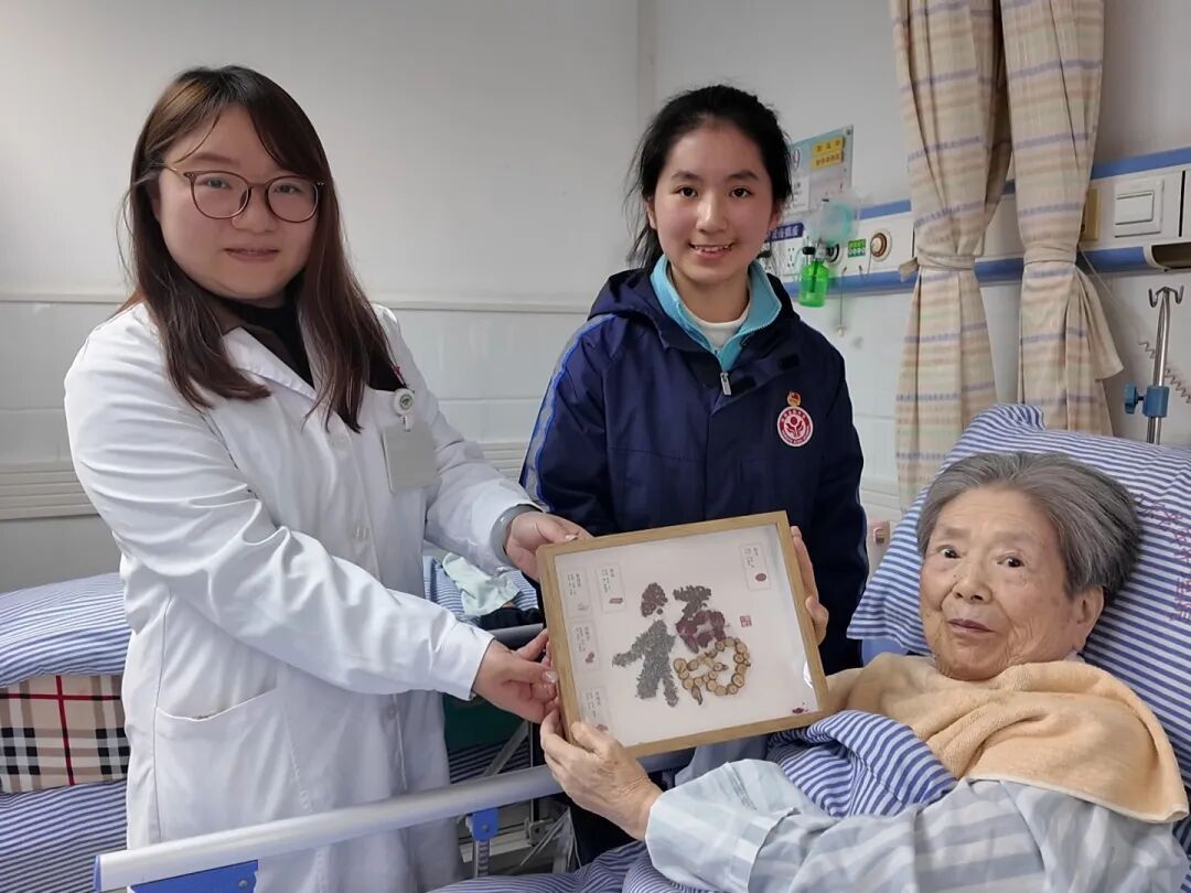 制作完成后,学生们捧着饱含祝福的“福”字中药画,逐一送到老人床前。103岁的王金囡老人接过礼物,笑得合不拢嘴,拉着学生的手舍不得放开:“开心啊!不要走!”稚嫩的祝福与沧桑的笑脸相映,成为病房里最动人的画面。