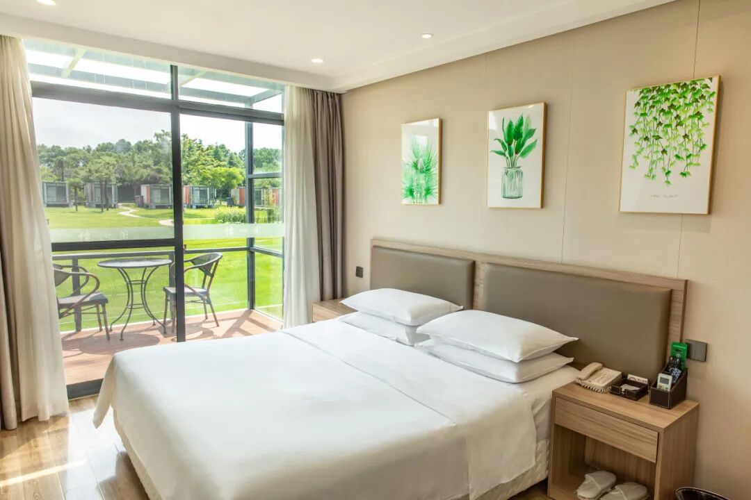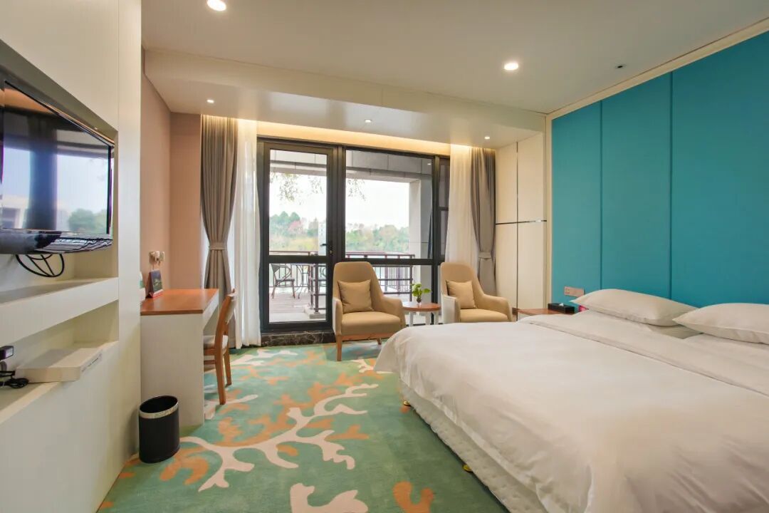 位于静谧的生态湿地区域,推窗即见开阔水岸与葱郁绿意。清晨,阳光洒入室内,远处水鸟掠过湖面,湿地的自然气息悄然唤醒一天的好心情。客房设计风格温润雅致,让宾客在自然环抱中享受从容惬意的休憩时光。