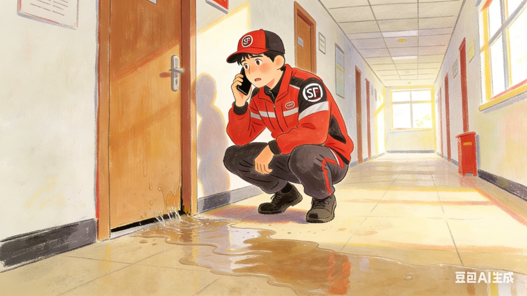 此时,顺丰速运的快递员张振威仍坚守在岗位上。当他派件至上海蔚洲电子科技有限公司所在楼栋时,一个细微的异常引起了他的警觉——有水正从楼内不断流出。