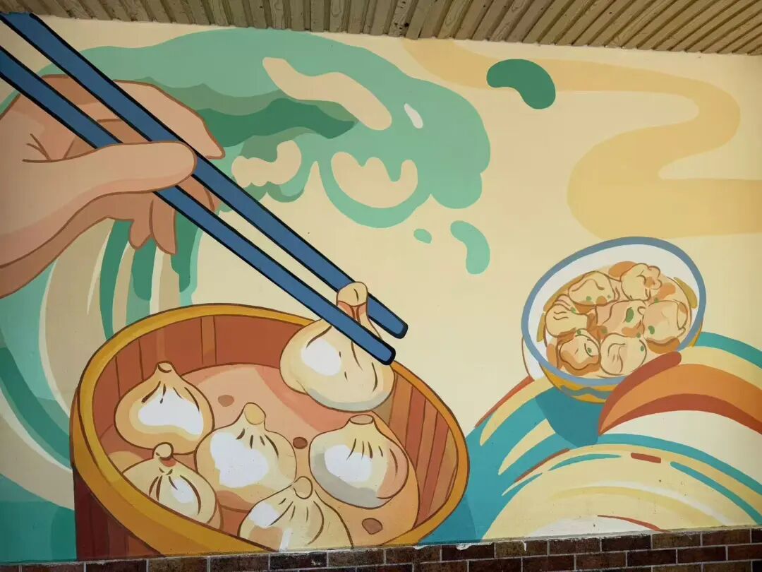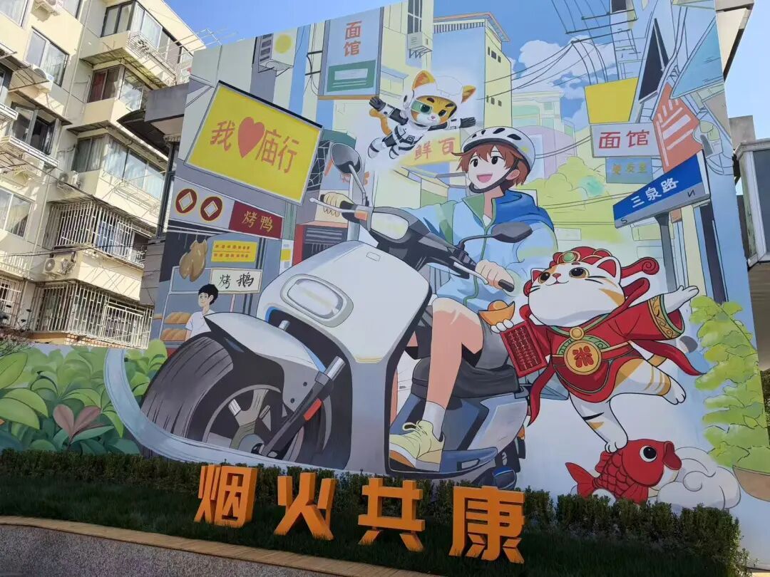 漫步在三泉路与和康路路口,一幅高达七米的墙绘首先映入眼帘。画面巧妙地捕捉了街区的日常:鳞次栉比的美食店、穿梭其间的外卖小哥,以艺术化形式呈现,一股浓郁的市井烟火气扑面而来。