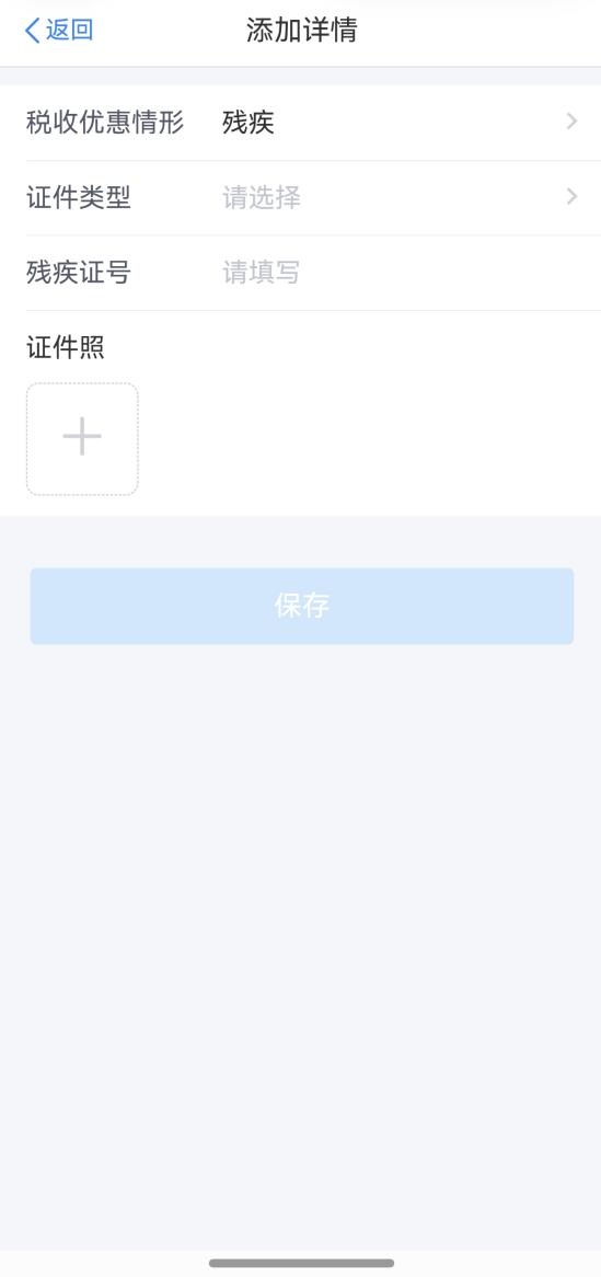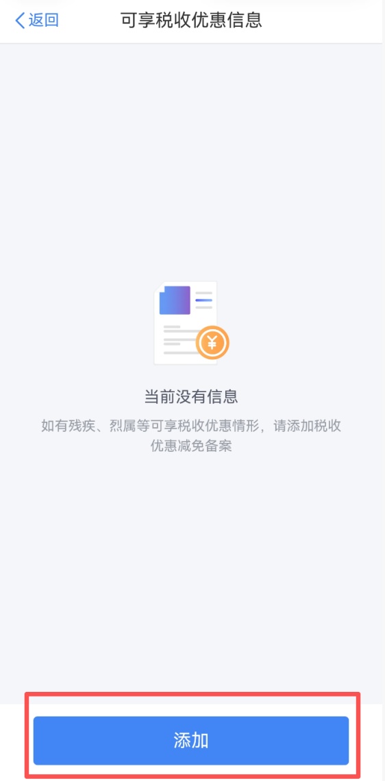 通过登录个人所得税App—我的—个人信息—可享税收优惠,若当前无信息,点击“添加”。