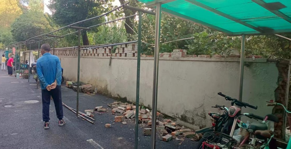 共宁小区这处30余米长的围墙,因建造年代久远,早已出现基础不牢、表面脱落、裂缝明显的问题,汛期的安全隐患更是让周边居民忧心忡忡。围墙毗邻小区内部主干道,周边居民楼密集,老年住户出行频繁,拆除危墙成为大家的共同期盼。
