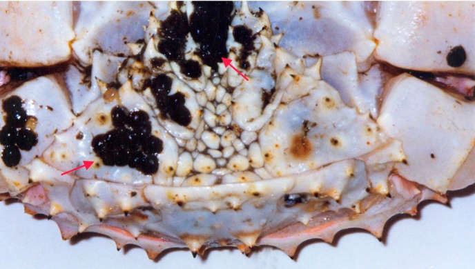 在雪蟹、帝王蟹等冷水性螃蟹或螃蟹类似物身上,常常能看到一些黑色的囊状物体,不少人见了以为是寄生虫,大惊失色不敢再吃,乃至闹上新闻的都有,其实这些是蟹蛭的卵鞘。